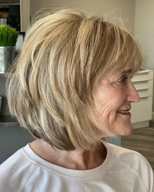 A neck-length blonde shaggy bob with bangs is a must-try for women in their seventies and beyond. It offers a stylish yet effortless vibe that flatters various face shapes.