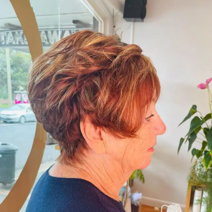 Use a styling wax to piece out the layers for definition and to give the cut extra shape. This short, choppy pixie is perfect for women over 70, offering a youthful and vibrant style.