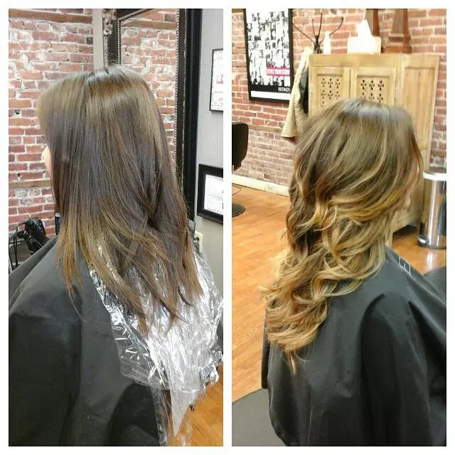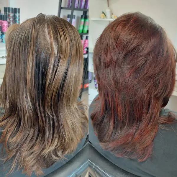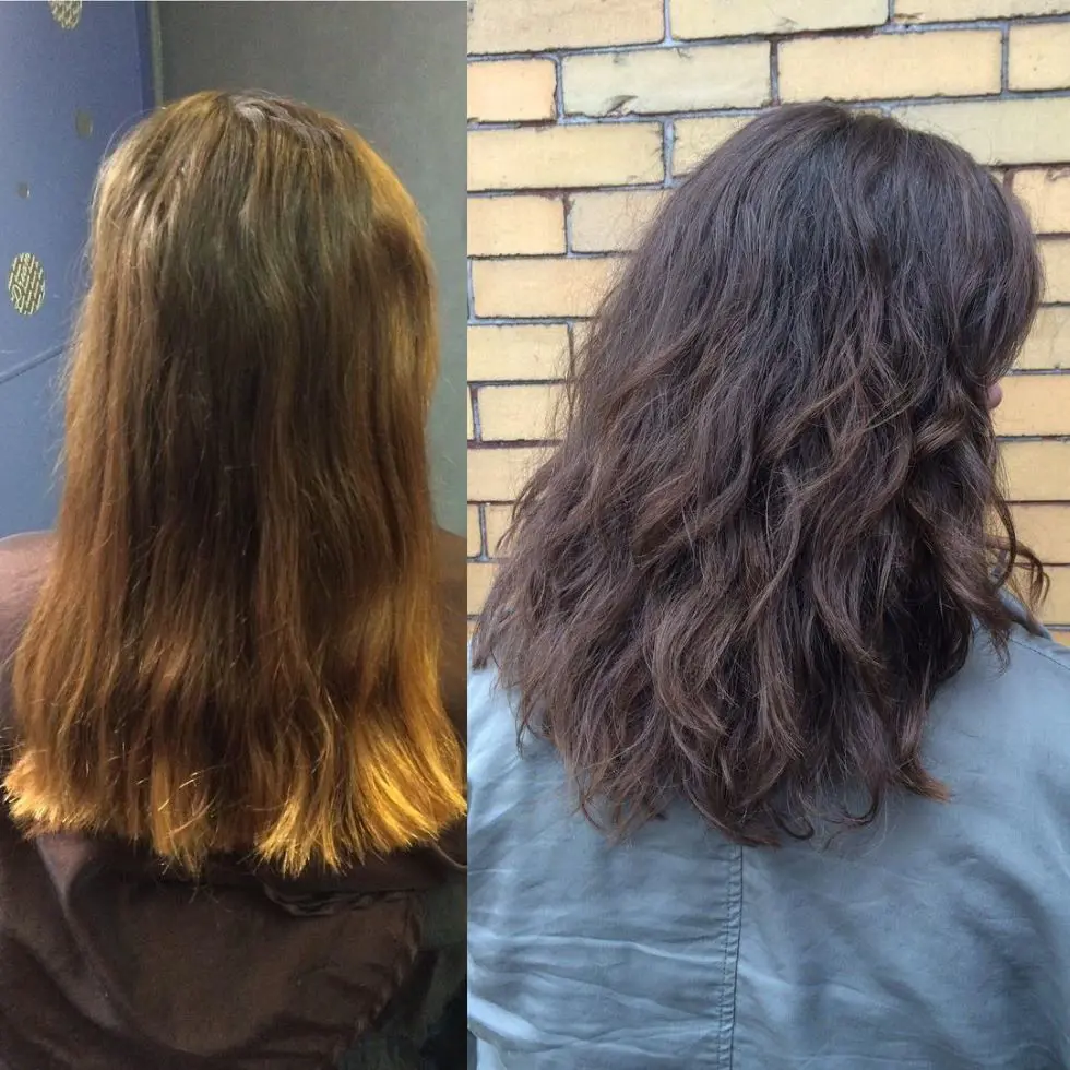 This photo highlights a remarkable transformation from a dull, faded honey balayage to a vibrant, layered look with a rich, dark color. The new style not only revitalizes the hair with depth and dimension but also adds a fresh, youthful appearance through strategically placed layers.