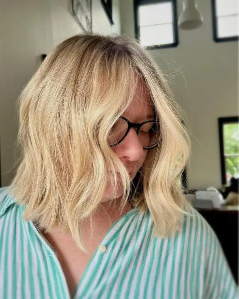 The shoulder-length cut is manageable and beautiful. Adding to its appeal, the dark roots create a natural and edgy contrast against the lighter blonde ends, enhancing the hairstyle with depth and dimension.