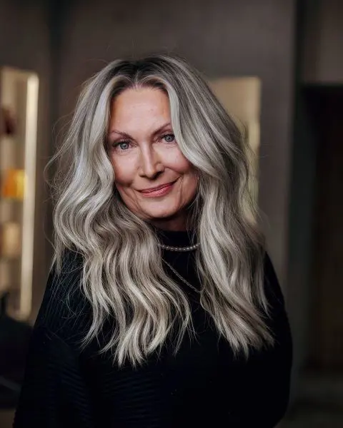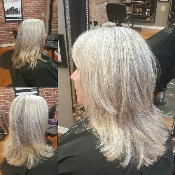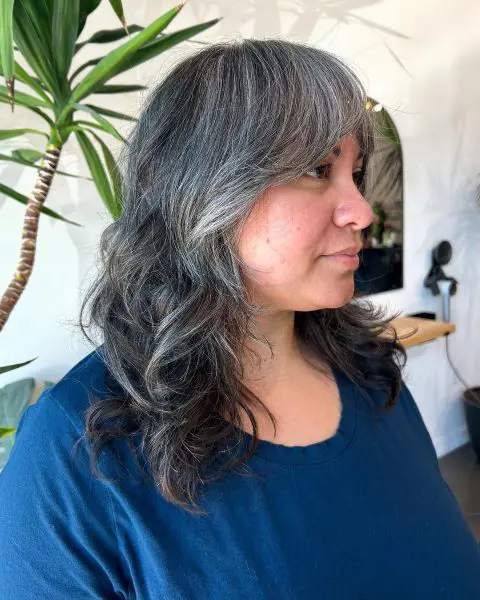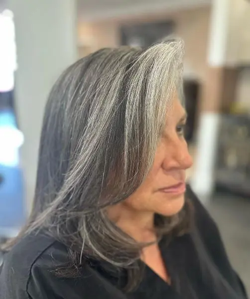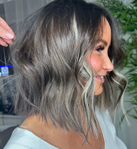 As you can see, the silver-grey balayage adds a chic, contemporary twist, offering a natural-looking gradient that transitions from darker roots to lighter, shimmering grey tones.