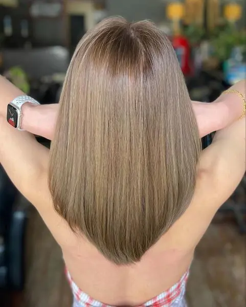 This style, characterized by its straight, clean lines, is designed to emphasize the hair's natural texture and shine. It provides a versatile base for a variety of looks while maintaining an elegant, no-fuss demeanor.