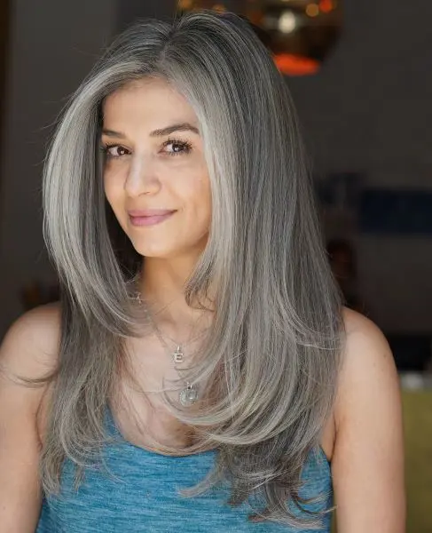 49. Layered Tresses with Gray Balayage
