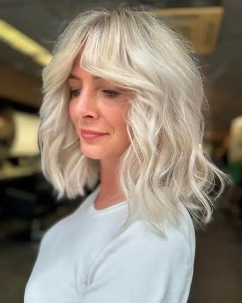 33. Medium Wavy Hairstyle with Framing Bangs