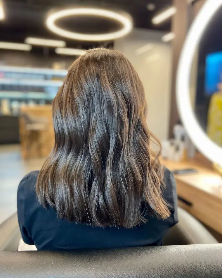 As you can see in the picture, the hair is styled with gentle waves, which add volume and movement. If you have it naturally, bingo! If not, you can create the waves using a curling iron or flat iron or by braiding the hair while wet and letting it air-dry.