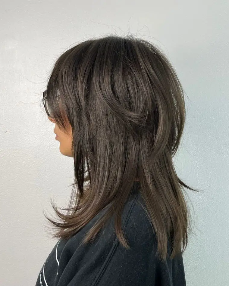 As seen in the picture, this hairstyle features two main layers that add depth and volume while maintaining the signature choppy, textured appearance of the wolf cut.