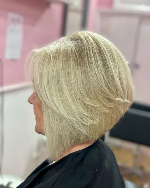 An angled bob for mature women features subtle layers, typically at the bottom, adding movement and shape.
