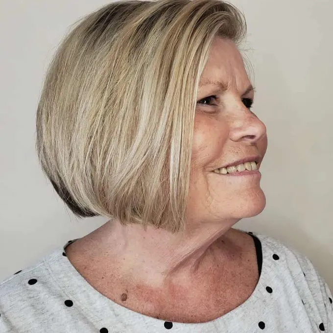 A blonde bob for women over 60 creates a youthful, radiant look. Blonde highlights effortlessly blend with natural grey hair, giving your style a fresh lift.