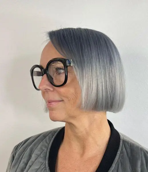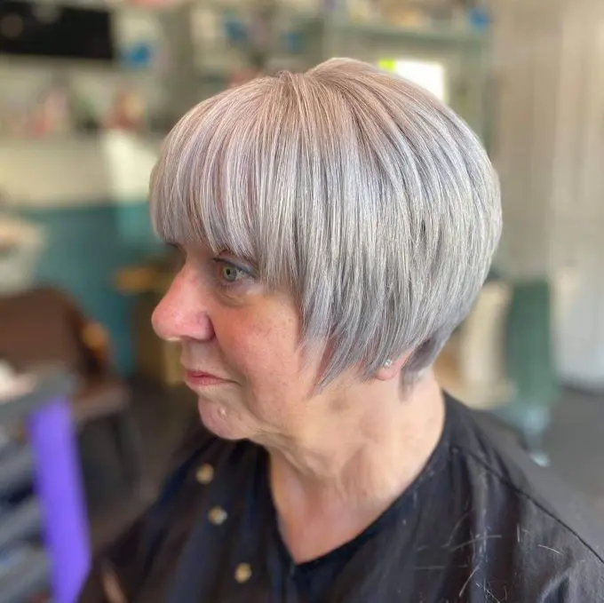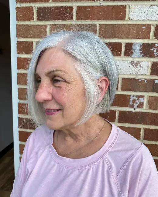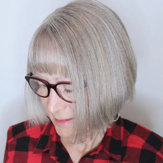 This sassy bob gives gray hair a fresh, modern twist, with ash blonde highlights adding lively depth to the classic cut.