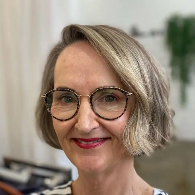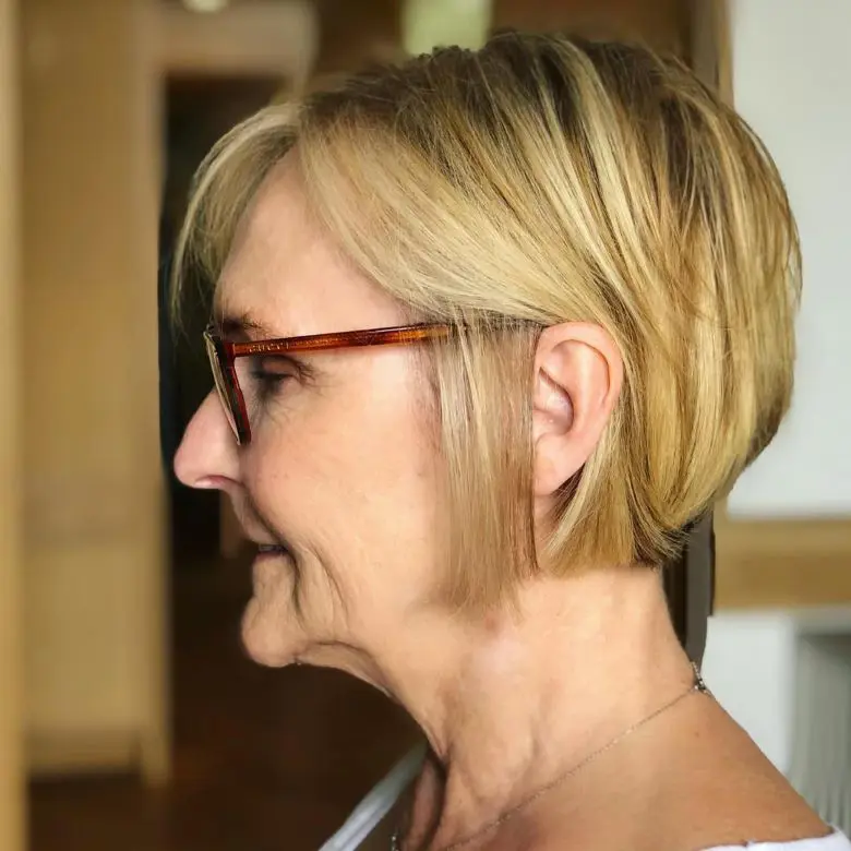 A textured bob for older women with glasses beautifully frames the face. However, it's important to choose a cut that doesn’t interfere with the lenses or frames.