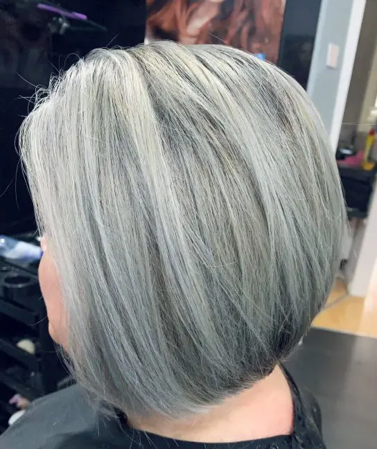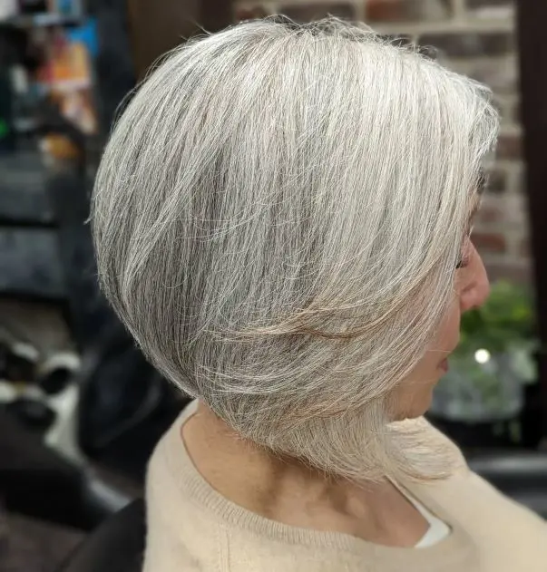 This graduated bob is perfect for older women embracing their natural hair color with style. Shorter in the back and longer in the front, it adds fullness and texture.