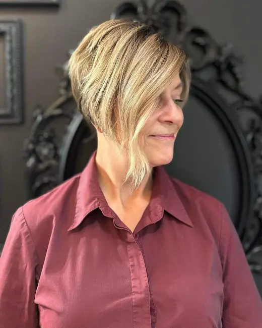 A stacked bob is a timeless haircut that never goes out of style. With seamless layers and a shorter back, this short bob cut adds volume and shape. Perfect for women of all ages and face shapes, it’s a versatile and flattering choice.