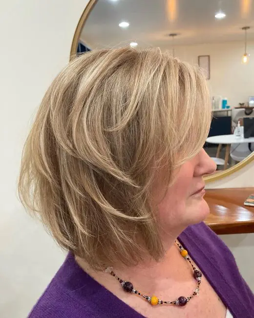 A feathered bob for women over 40 combines soft, airy layers with an edgy vibe. Ideal for ladies with thick hair, the layers create a light, feathery look that’s both stylish and easy to wear.
