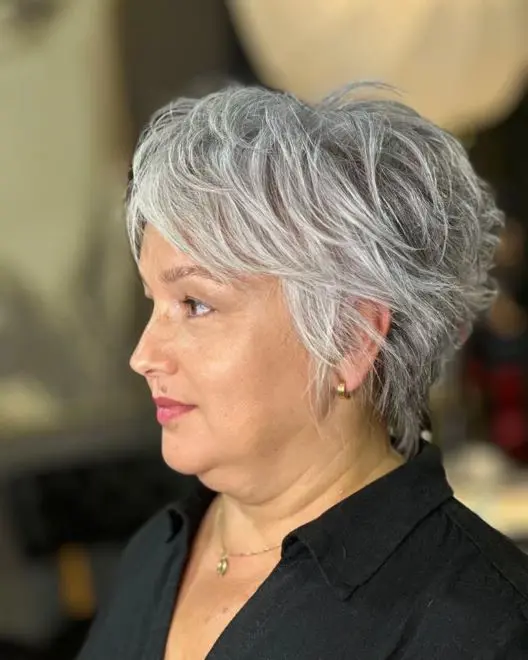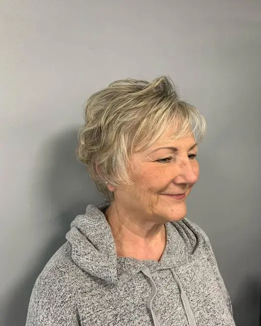 A short pixie bob with bangs is a great choice for older women, adding thickness and texture to fine, thinning hair. Short, choppy layers create height at the crown, boosting volume.