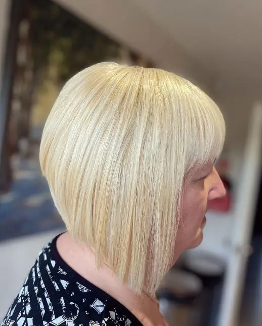 This inverted bob is a stylish choice that complements the pixie bob with bangs trend for older women. With a longer front and shorter back, it offers a modern twist.